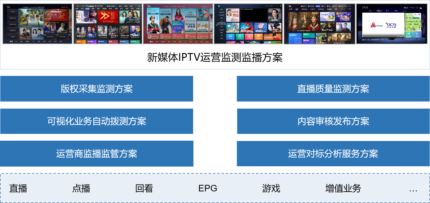 版權采集/直播質量監測/可視化業務撥測/內容審核發布/運營商監播監管/運營對標分析