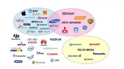 AVS標準的一大創新是在標準制定之前先確立許可模式:凡是向AVS工作組提交技術和提案的單位都需要對其專利許可意向做出承諾,允許“免費使用”或者“加入AVS專利池”。這一機制解決了目前國際標準制定時缺乏對技術許可政策的約束,造成因為專利授權政策問題難以推廣的弊端。最近由于HEVC/H.265飽受專利授權政策混亂困擾,連MPEG主席Leonardo也承認:MPEG只考慮性能不考慮授權成本制定標準的“商業模式”面臨破裂。如下圖所示,目前已知的H.265/HEVC的專利持有人情況:共有43家公司持有H.265/HEVC專利,其中17家公司在MPEGLA專利池中,8家公司在HEVCAdvance專利池中,5家公司在VelosMedia專利池中,2家公司同時加入了MPEGLA和HEVCAdvance專利池,還有15家公司沒有加入任何專利池。MPEGLA和HEVCAdvance已發布H.265/HEVC的專利權使用費和許可政策,并多次進行了修訂,在目前的政策中,這兩家專利池大幅提升了專利收費額度。而VelosMedia,Technicolor和另外14家公司暫時沒有公布自己的收費政策。總體上,HEVC/H.265存在巨大的潛在專利費用風險,一定程度上制約了它的普及應用。