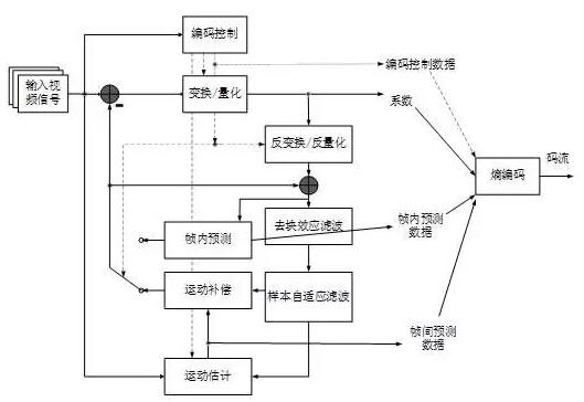 AVS2標準的目標應用是超高清視頻壓縮,沿用了混合編碼框架,整個編碼過程包括幀內預測、幀間預測、變換量化、反量化反變換、環路濾波和熵編碼等模塊。