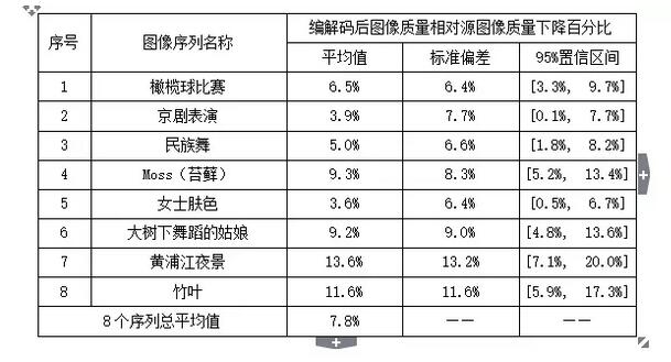 編碼器視頻壓縮碼率在35Mbps時,對于AVS產業聯盟/推進工作組推薦的8個不同測試序列,其主觀評價平均圖像質量下降百分比(相對于源序列)不大于9%,任何單一序列主觀評價圖像質量下降百分比(相對于源序列)不大于20%。
